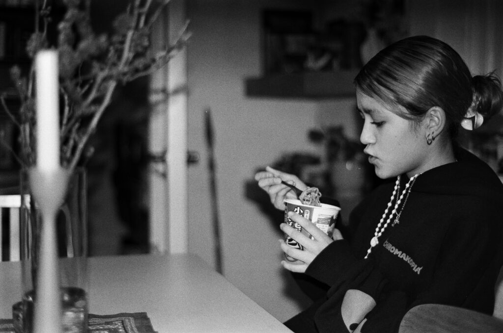 Just a couple of photos of the crew — in black and white — eating in the dining room. Lulu always likes to sneak onto the table give us kisses.